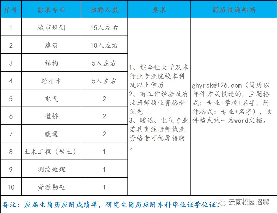 【昆明招聘】云南省城乡规划设计研究院2019年春季招聘公告一、云南省城乡规划设计研究院简介 云南省城乡规划设计研究院(以下简称省规划院)成立于1984年,是一家在规划界享有声誉的大型省级规划设计院。 省规划院拥有全面、专业的设计资质,全力提供我省城乡建设智慧支撑。目前拥有城市规划、建筑工程、市政公用行业道路、风景园林、旅游规划、工程咨询(城市规划、建筑、市政交通)等六个甲级资质;拥有市政公用行业给水工程设计、市政公用行业排水工程设计、市政公用行业环境卫生工程设计、工程勘察专业类(岩土工程、水文地质勘察、工程测量)设计、工程咨询(给水、排水)等五个乙级资质;市政公用行业(供配电、公路)两个丙级资质;房屋建筑和市政基础设施工程施工图审查一类资质及规划环境影响评价、工程总承包、桩基检测、司法鉴定、施工图审查等资质。 省规划院业务范围涉及城市规划、建筑工程设计、市政公用设计、工程总承包、旅游规划、风景园林设计、给水排水、建设项目可行性研究、建筑智能化系统工程设计、工程咨询、工程勘察、工程项目管理、桩基检测、司法鉴定、规划环境影响评价等多个领域。 省规划院海纳四方人才,为持续发展并保持行业领先奠定了坚实的人才基础。全院共有职工485人,专业技术人员453人,占职工总数 93 %,本科以上学历占职工总数的93 %。我院的专业技术人员中,具备正高级专业技术职务资格的27人,占专业技术人员的6%;具备副高级专业技术职务资格的152人,占专业技术人员的34%;具备中级专业技术职务资格的171人,占专业技术人员的 38%,拥有各类注册师104人。设有5个分院、5个独立设计机构、6个个人工作室的生产组织构架,是一支专业配置齐全,技术力量雄厚,能力强、素质高的专业规划设计团队,位列云南省规划设计行业前列。 省规划院立足云南、面向全国,业务精良、成绩卓著。建院三十余年,先后荣获部级、省级优秀城市规划设计、优秀工程设计、科技进步奖等奖项235项。古城镇保护规划、风景名胜区规划、城镇特色规划、旅游规划在全国拥有重要专业地位。曾获全国优秀规划设计研究院、全国“五一”劳动奖章、全国建设人才先进工作单位、全国建设科技进步先进集体、全国勘察设计行业创新性优秀企业、云南省建筑业发展突出贡献企业等荣誉。出版有《城市空间的选择现实》、《我们的名城名镇》、《我们的“特质”建筑》、《云南建筑百年》等学术著作。 省规划院秉承“自强不息、开拓创新、持续发展、和谐安康”的精神,坚持与古人握手、与未来对话、与云南多样性相拥,致力为建设美丽云南勤耕不辍。 二、2019年春季招聘岗位 三、招聘流程 投递简历→简历初选→笔试(2019年1月22日)→面试(2019年1月23日)→录用→签订劳动合同。 *若因学校放假晚不能按时参加2019年1月22日笔试的应聘人员,可先报名视情况另行安排考试时间 四、联系方式 联系人:毛老师、杨老师、徐老师 电话:0871-64315776、64137379 邮箱:ghyrsk@126.com 网址:www.yncityplan.com (来源:云南省城乡规划设计研究院)